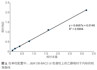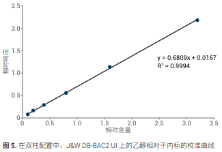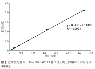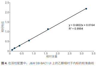 在 J&W DB-BAC1 UI 和 J&W DB-BAC2 UI 色譜柱上進行校準,首先分別在兩根色譜 柱上進行,然后采用雙柱雙 FID 配置進行 校準。在兩種情況下,采用濃度為 10、 20、40、80、160、320 mg/dL 乙醇水溶液(以 100 mg/dL 正丙醇作為內標) 采集六種濃度的校準曲線。每個濃度重 復進樣 (n = 3)。圖 2 和圖 3 顯示了分別 在單色譜柱配置中的 J&W DB-BAC1 UI 和 J&W DB-BAC2 UI 色譜柱上得到的乙醇校 準曲線。