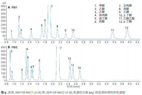 圖 6 中的色譜圖顯示,采用兩種色譜柱 可使 BAC 校驗混標中的所有 12 種化合物 彼此分離,包括乙醛和乙醇。兩種色譜柱 上得到的所有峰均顯示出良好對稱性。
