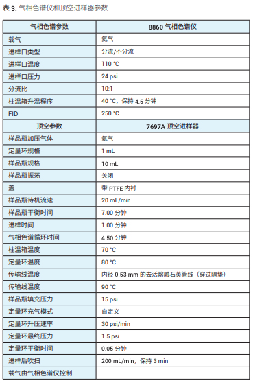 表 3 列出了本應用簡報中使用的氣相色 譜儀和頂空進樣器的方法參數。