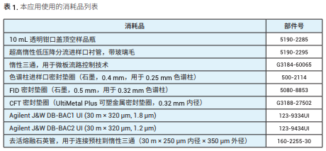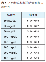 表 1 列出了本應用簡報中使用的消耗 品。表 2 列出了安捷倫提供的乙醇標準 品。這些標準品組合可創建準確的校準 標樣,或單獨使用以檢查校準曲線的準 確度。