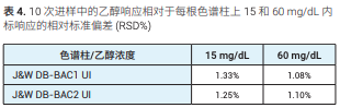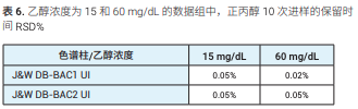 分別在 15 和 60 mg/dL 下測定面積和保 留時間重復性(表 4 至表 6)。 表 4 顯示每種濃度及色譜柱的 RSD 均小 于 2%。
